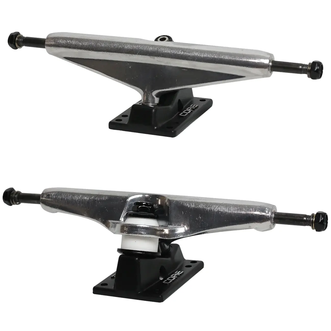 Create an accounttrucks offer hollow kingpins which simultaneously lower the weight of the truck while increasing strength and performance. Featuring hollow body kingpins, lightweight aluminum alloy hangers, heavy duty baseplates, and premium USA Made Bushings and Pivot Cups. Super high rebound (SHR) bushings and pivot cups offer a responsive, smooth, and consistent ride. All Core Trucks are assembled in the USA. Size 7.0 - 9.63" Axle Length - Fits Decks 9.0" and larger.